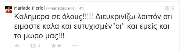 Η Μαριάντα Πιερίδη δίνει τέλος στις φήμες που την θέλουν να έχει χωρίσει μέσω του προσωπικού της λογαριασμού στο twitter.