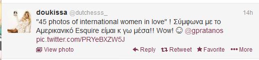 Την είδηση αυτή την ανάρτησε και η ίδια η Δούκισσα μέσα από τον προσωπικό της λογαριασμό στο twitter γράφοντας: “Σύμφωνα με το αμερικανικό Esquire είμαι και εγώ μέσα”.