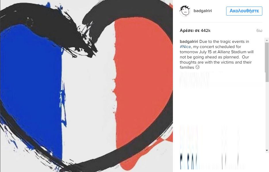 «Εξαιτίας των τραγικών γεγονότων στην Νίκαια, η συναυλία μου έχει προγραμματιστεί για αύριο στις 15 Ιουλίου στο Allianz Stadium δεν πραγματοποιηθεί. Οι σκέψεις μας είναι με τα θύματα και τις οικογένειές τους», έγραψε η Ριάνα στο Instagram.