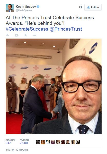 Ο λόγος για τον Αμερικανό ηθοποιό Κέβιν Σπέισι, που μοιράστικε το στιγμιότυπο στον προσωπικό του λογαριασμό στο Twitter, δείχνοντας τη χιουμοριστική του πλευρά, καθώς την στιγμή της φωτογραφίας ο πρίγκιπας Κάρολος στεκόταν ανυποψίαστος, ακριβώς πίσω του στο κόκκινο χαλί των βραβείων «Celebrate Success» της φιλανθρωπικής οργάνωσης «Prince Trust», την Πέμπτη το βράδυ.