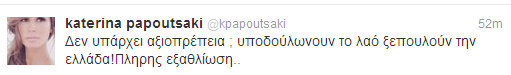 Η Κατερίνα Παπουτσάκη πολλές φορές έχει εκφράσει την δυσαρέσκεια και την απογοήτευση της για την πολιτική και οικονομική κατάσταση της χώρας μας.Πριν από λίγο, λοιπόν, έγραψε στο twitter της:
