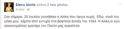 «Σαν σήμερα, 20 Ιουλίου γεννήθηκε η Αλίκη που έφυγε νωρίς. Εδώ, νονά του γιόκα μου, λάμπει από ευτυχία στα βαφτίσια άνοιξη του 1994. Η Αλίκη κι εγώ (κοκκινομάλλα) κρατάμε τον Παύλο μας αγκαλίτσα» έγραψε η Έλενα Ακρίτα.