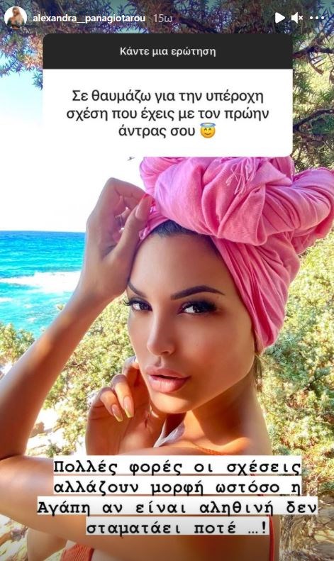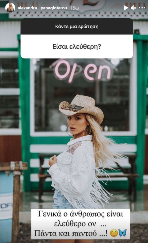 Η Αλεξάνδρα Παναγιώταρου, ως λάτρης των social media, θέλησε να απαντήσει σε ερωτήσεις των διαδικτυακών της φίλων στο Ιnstagram. Εξάλλου είναι πολύ ενεργή στα κοινωνικά δίκτυα και μοιράζεται συχνά στιγμές από την καθημερινότητά της. Στο πλαίσιο του Q&A που έκανε, μέσω του προσωπικού της λογαριασμού, απάντησε και για όσα ακούγονται σχετικά με την προσωπική της ζωή. Συγκεκριμένα, κάποιος τη ρώτησε εάν είναι ελεύθερη αυτή την περίοδο. Εκείνη, απάντησε γενικά και αόριστα, χωρίς να ξεκαθαρίσει ουσιαστικά αν τελικά βρίσκεται σε σχέση. «Γενικά ο άνθρωπος είναι ελεύθερο ον… Πάντα και παντού!», απάντησε η Αλεξάνδρα Παναγιώταρου.