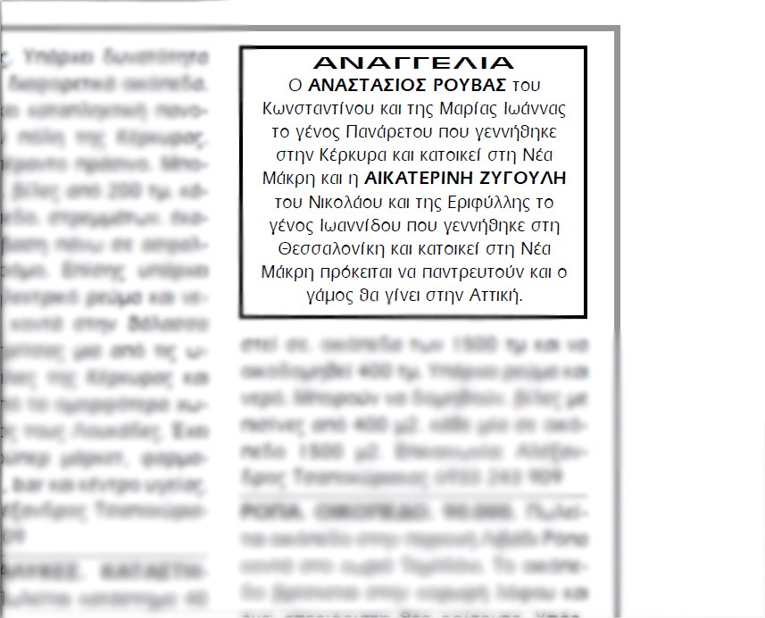 Στην αναγγελία αναφέρεται: «Ο Αναστάσιος Ρουβάς του Κωνσταντίνου και της Μαρίας Ιωάννας, το γένος Πανάρετου, που γεννήθηκε στην Κέρκυρα και κατοικεί στη Νέα Μάκρη και η Αικατερίνη Ζυγούλη του Νικολάου και της Εριφύλλης, το γένος Ιωαννίδου, που γεννήθηκε στη Θεσσαλονίκη και κατοικεί στη Νέα Μάκρη πρόκειται να παντρευτούν και ο γάμος θα γίνει στην Αττική».