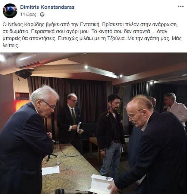 “Ο Ντίνος Καρύδης βγήκε από την εντατική. Βρίσκεται πλέον στην ανάρρωση, σε δωμάτιο. Περαστικά σου αγόρι μου. Το κινητό σου δεν απαντά ….όταν μπορείς θα απαντήσεις. Ευτυχώς μιλάω με τη Τζούλια. Με την αγάπη μας. Μας λείπεις” έγραψε στο Facebook ο Δημήτρης Κωνσταντάρας.