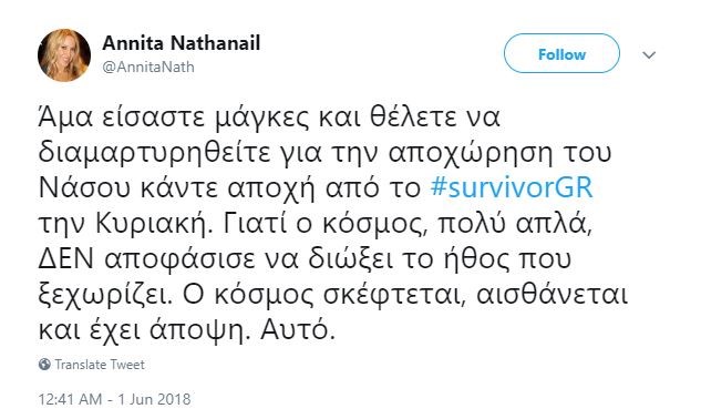 Μία από αυτούς είναι και η Αννίτα Ναθαναήλ, η οποία διαμαρτυρήθηκε για την αποχώρησή του, γράφοντας στο twitter: «Άμα είσαστε μάγκες και θέλετε να διαμαρτυρηθείτε για την αποχώρηση του Νάσου κάντε αποχή από το #survivorGR την Κυριακή. Γιατί ο κόσμος, πολύ απλά, ΔΕΝ αποφάσισε να διώξει το ήθος που ξεχωρίζει. Ο κόσμος σκέφτεται, αισθάνεται και έχει άποψη. Αυτό».