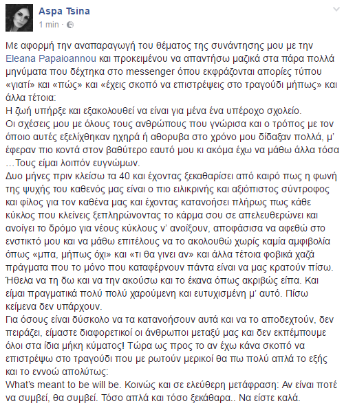 Τη δική της απάντηση μέσω του προσωπικού της λογαριασμού στο facebook, έδωσε η Άσπα Τσίνα, με αφορμή τη συνάντησή της με την Ελεάνα Παπαϊωάννου, στο νυχτερινό κέντρο όπου εμφανίζεται η τελευταία.