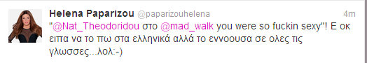 “Η καλύτερη άμυνα είναι η επίθεση”!Μόλις πριν από λίγο, η Έλενα Παπαρίζου, έδωσε την δική της απάντηση, για το ”hot” κοπλιμέντο -θυμάστε, την αποκάλεσε δημοσίως “μου..άρα”- που έκανε στην Νατάσα Θεοδωρίδου και προκάλεσε. Έγραψε λοιπόν στο twitter: