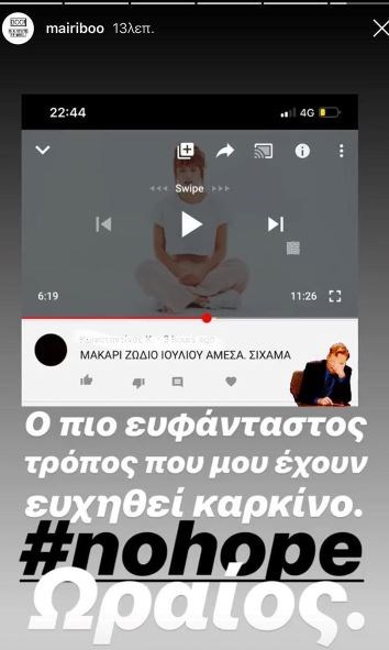 Μάλιστα, η Μαίρη Συνατσάκη ιδιαίτερα ενοχλημένη δεν δίστασε να του απαντήσει δημόσια μέσα από τα instastories γράφοντας χαρακτηριστικά: «Ο πιο ευφάνταστος τρόπος που μου έχουν ευχηθεί να πάθω καρκίνο .No hope.Ωραίος».