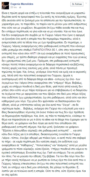 Συγκεκριμένα η Ευγενία Μανωλίδου έγραψε στο λογαριασμό της στο Facebook: