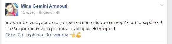 “Προσπαθεί να αγοράσει αξιοπρέπεια και σεβασμό και νομίζει ότι τα κέρδισε!!! Πολλοί μπορούν να κερδίσουν… εγώ όμως θα νικήσω!” έγραψε.
