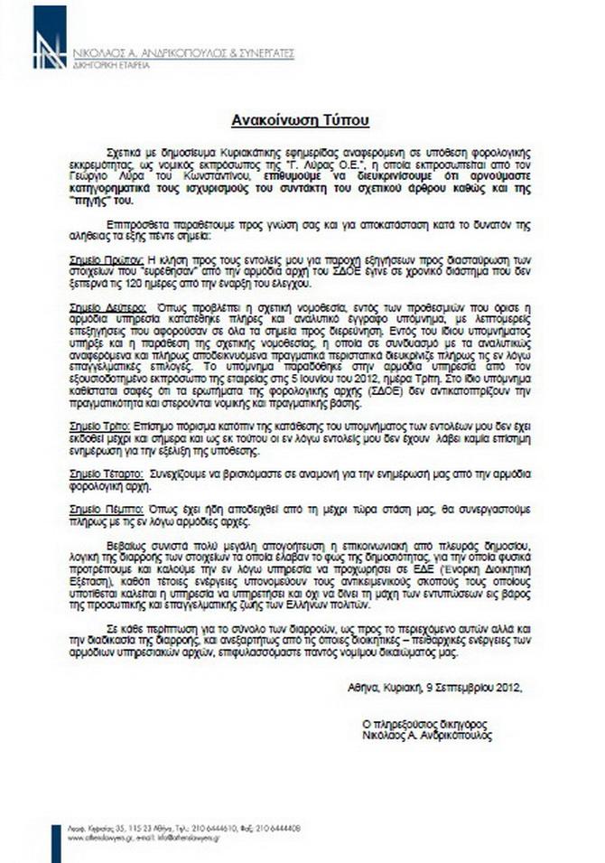 Η ανακοίνωση όπως απεστάλη χτες από το γραφείο του δικηγόρου, κυρίου Νικόλαου Ανδρικόπουλου:«Σχετικά με δημοσίευμα Κυριακάτικης εφημερίδας αναφερόμενη σε υπόθεση φορολογικής εκκρεμότητας, ως νομικός εκπρόσωπος της “Γ. Λύρας Ο.Ε.”, η οποία εκπροσωπείται από τον Γεώργιο Λύρα του Κωνσταντίνου, επιθυμούμε να διευκρινίσουμε ότι αρνούμαστε κατηγορηματικά τους ισχυρισμούς του συντάκτη του σχετικού άρθρου καθώς και της “πηγής” του.Επιπρόσθετα παραθέτουμε προς γνώση σας και για αποκατάσταση κατά το δυνατόν της αλήθειας τα εξής πέντε σημεία:Σημείο Πρώτο: Η κλήση προς τους εντολείς μου για παροχή εξηγήσεων προς διασταύρωση των στοιχείων που “ευρέθησαν” από την αρμόδια αρχή του ΣΔΟΕ έγινε σε χρονικό διάστημα που δεν ξεπερνά τις 120 ημέρες από την έναρξη του έλεγχου.Σημείο Δεύτερο: Όπως προβλέπει η σχετική νομοθεσία, εντός των προθεσμιών που όρισε η αρμόδια υπηρεσία κατατέθηκε πλήρες και αναλυτικό έγγραφο υπόμνημα, με λεπτομερείς επεξηγήσεις που αφορούσαν σε όλα τα σημεία προς διερεύνηση. Εντός του ίδιου υπομνήματος υπήρξε και η παράθεση της σχετικής νομοθεσίας, η οποία σε συνδυασμό με τα αναλυτικώς αναφερόμενα και πλήρως αποδεικνυόμενα πραγματικά περιστατικά διευκρίνιζε πλήρως τις εν λόγω επαγγελματικές επιλογές. Το υπόμνημα παραδόθηκε στην αρμόδια υπηρεσία από τον εξουσιοδοτημένο εκπρόσωπο της εταιρείας στις 5 Ιουνίου του 2012, ημέρα Τρίτη. Στο ίδιο υπόμνημα καθίσταται σαφές ότι τα ερωτήματα της φορολογικής αρχής (ΣΔΟΕ) δεν αντικατοπτρίζουν την πραγματικότητα και στερούνται νομικής και πραγματικής βάσης.Σημείο Τρίτο: Επίσημο πόρισμα κατόπιν της κατάθεσης του υπομνήματος των εντολέων μου δεν έχει εκδοθεί μέχρι και σήμερα και ως εκ τούτου οι εν λόγω εντολείς μου δεν έχουν λάβει καμία επίσημη ενημέρωση για την εξέλιξη της υπόθεσης.Σημείο Τέταρτο: Συνεχίζουμε να βρισκόμαστε σε αναμονή για την ενημέρωσή μας από την αρμόδια φορολογική αρχή.Σημείο Πέμπτο: Όπως έχει ήδη αποδειχθεί από τη μέχρι τώρα στάση μας, θα συνεργαστούμε πλήρως με τις εν λόγω αρμόδιες αρχές.Βεβαίως συνιστά πολύ μεγάλη απογοήτευση η επικοινωνιακή από πλευράς δημοσίου, λογική της διαρροής των στοιχείων τα οποία έλαβαν το φως της δημοσιότητας, για την οποία φυσικά προτρέπουμε και καλούμε την εν λόγω υπηρεσία να προχωρήσει σε ΕΔΕ (Ένορκη Διοικητική Εξέταση), καθότι τέτοιες ενέργειες υπονομεύουν τους αντικειμενικούς σκοπούς τους οποίους υποτίθεται καλείται η υπηρεσία να υπηρετήσει και όχι να δίνει τη μάχη των εντυπώσεων εις βάρος της προσωπικής και επαγγελματικής ζωής των Ελλήνων πολιτών.Σε κάθε περίπτωση για το σύνολο των διαρροών, ως προς το περιεχόμενο αυτών αλλά και την διαδικασία της διαρροής, και ανεξαρτήτως από τις όποιες διοικητικές – πειθαρχικές ενέργειες των αρμόδιων υπηρεσιακών αρχών, επιφυλασσόμαστε παντός νομίμου δικαιώματός μας».Αθήνα, Κυριακή, 9 Σεπτεμβρίου 2012,Ο πληρεξούσιος δικηγόροςΝικόλαος Α. Ανδρικόπουλος