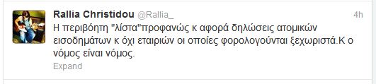 Ο ένας μετά τον άλλο οι καλλιτέχνες απαντούν αναφορικά με το δημοσίευμα για τις δηλώσεις τους στην εφορία. Μέσα από τον προσωπικό της λογαριασμό στο Twitter η Ραλλία Χρηστίδου, έγραψε σχετικά: «Η περιβόητη “λίστα” προφανώς κ αφορά δηλώσεις ατομικών εισοδημάτων κ όχι εταιριών οι οποίες φορολογούνται ξεχωριστά.Κ ο νόμος είναι νόμος… Εγώ δεν έχω εταιρία. Δεν μου χρειάζεται. Είμαι με μπλοκάκι».