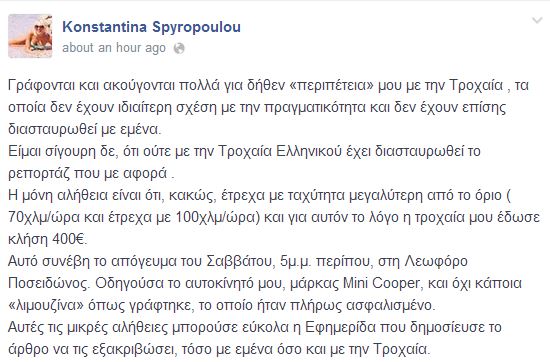 “Γράφονται και ακούγονται πολλά για δήθεν «περιπέτεια» μου με την Τροχαία , τα οποία δεν έχουν ιδιαίτερη σχέση με την πραγματικότητα και δεν έχουν επίσης διασταυρωθεί με εμένα.