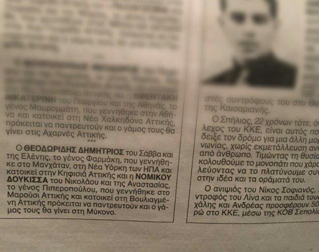 Καθώς η Δούκισσα Νομικού ετοιμάζεται να ντυθεί νύφη στο πλευρό του Δημήτρη Θεοδωρίδη, δημοσιεύθηκε, όπως απαιτείται, και η αναγγελία του γάμου τους.Το ζευγάρι επέλεξε τον «Ριζοσπάστη» για να δημοσιεύσει την αναγγελία του γάμου τους, που θα γίνει στη Μύκονο.