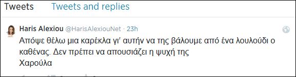 Η Χάρις Αλεξίου έχασε ένα πολύ αγαπημένο της πρόσωπο λίγες ώρες πριν από τη συναυλία της Παρασκευής στο Κατράκειο μαζί με την Τάνια Τσανακλίδου. Η μεγάλη Ελληνίδα τραγουδίστρια γνωστοποίησε την απώλεια μέσω Twitter και συγκίνησε τους followers της με την επιθυμία που εξέφρασε: