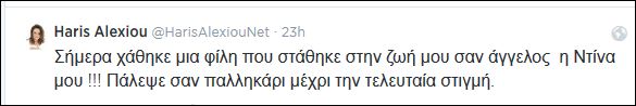 «Σήμερα χάθηκε μια φίλη που στάθηκε στην ζωή μου σαν άγγελος η Ντίνα μου !!! Πάλεψε σαν παλληκάρι μέχρι την τελευταία στιγμή.