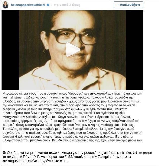 Σήμερα “απολογήθηκε” μέσα από τα social media και όπως είναι φυσικό αναφέρθηκε στα παιδικά της χρόνια και στη Σουηδία… Στη συνέχεια μας αποκάλυψε το τραγούδι της Σωτηρίας Μπέλου που άκουγαν στο σπίτι της…