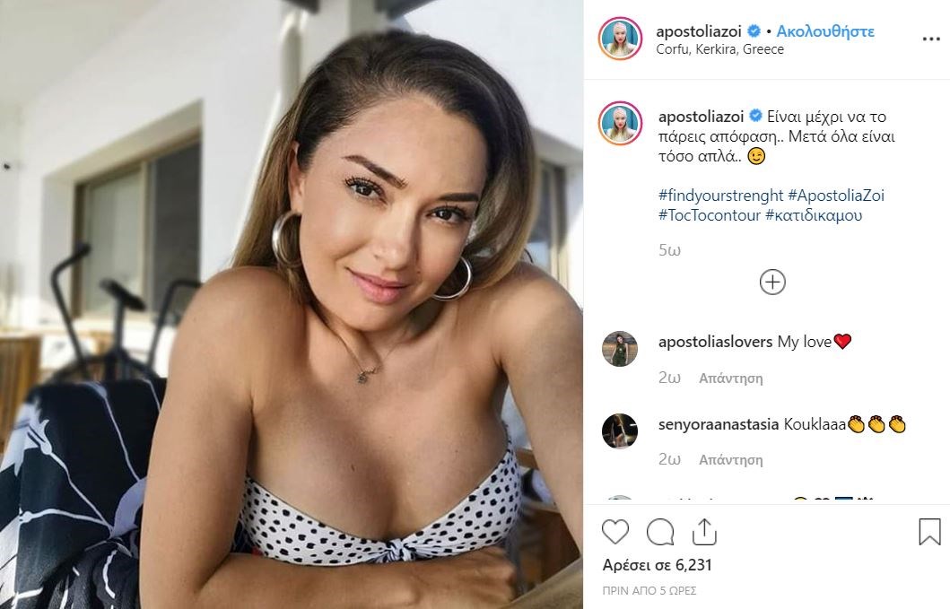 Η Αποστολία Ζώη έχει ανεβάσει σήμερα μια φωτογραφία με πουά μαγιό, το οποίο αποκαλύπτει το σέξι μπούστο της και τα σχόλια που λαμβάνει από τους followers της ήταν παραπάνω από θετικά. Συνοδεύει δε, την φωτογραφία με την ατάκα “είναι μέχρι να το πάρεις απόφαση… Μετά όλα είναι τόσο απλά”…