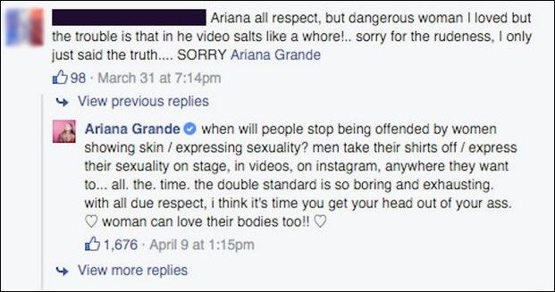 Έτσι συνέβη και με έναν, μάλλον αγενή follower της στο Facebook,ο οποίος την κατηγόρησε λέγοντάς της πως στο καινούργιο της video clip, «Dangerous Woman», μοιάζει με πόρνη, «με όλο το σεβασμό».