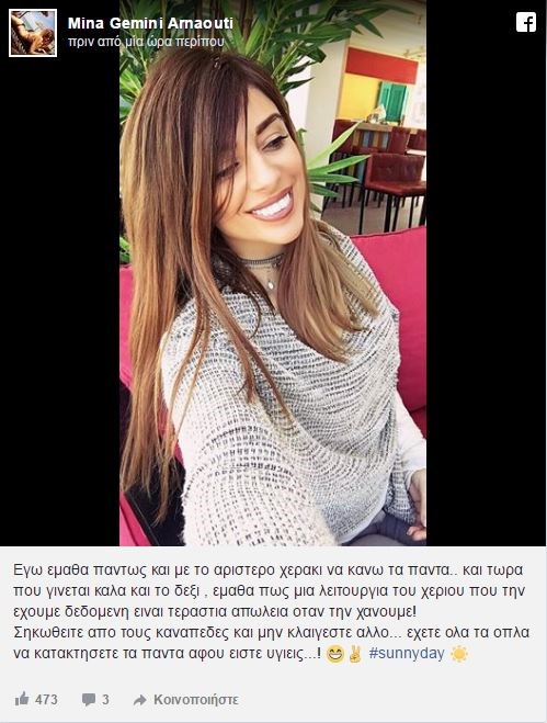 Η Μίνα Αρναούτη, έχει ανεβάσει πολλές φορές φωτογραφίες της στον προσωπικό της λογαριασμό στο Facebook, από την επίσκεψή της στον φυσιοθεραπευτή αλλά και από το νοσοκομείο, χωρίς να αποκαλύπτει ακριβώς ποιο είναι το πρόβλημα υγείας που αντιμετωπίζει μετά το τροχαίο που έχασε τη ζωή του ο Παντελής Παντελίδης.Αυτή τη φορά αποφάσισε να μιλήσει συγκεκριμένα και γνωστοποίησε το κινητικό πρόβλημα που αντιμετωπίζει με το χέρι της. Συγκεκριμένα, ανέβασε μια φωτογραφία της και έγραψε χαρακτηριστικά:«Εγώ έμαθα πάντως και με το αριστερό χεράκι να κάνω τα πάντα.. και τώρα που γίνεται καλά και το δεξί, έμαθα πως μια λειτουργία του χεριού που την έχουμε δεδομένη είναι τεράστια απώλεια όταν την χάνουμε! Σηκωθείτε από τους καναπέδες και μην κλαίγεστε άλλο… έχετε όλα τα όπλα να κατακτήσετε τα πάντα αφού είστε υγιείς».