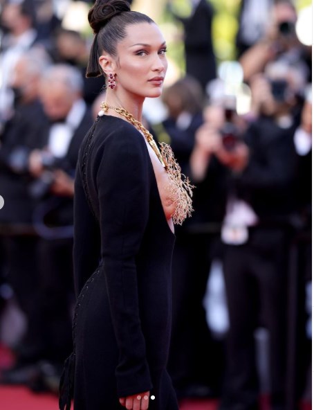 Η Χαντίντ φόρεσε ένα μακρυμάνικο μαύρο φόρεμα με αβυσσαλέο ντεκολτέ, έτσι ώστε το κολιέ να ξεχωρίζει. Αυτή είναι η πιο πρόσφατη εμφάνιση του μοντέλου, καθώς έφτασε στο κόκκινο χαλί για την προβολή της ταινίας Annette.