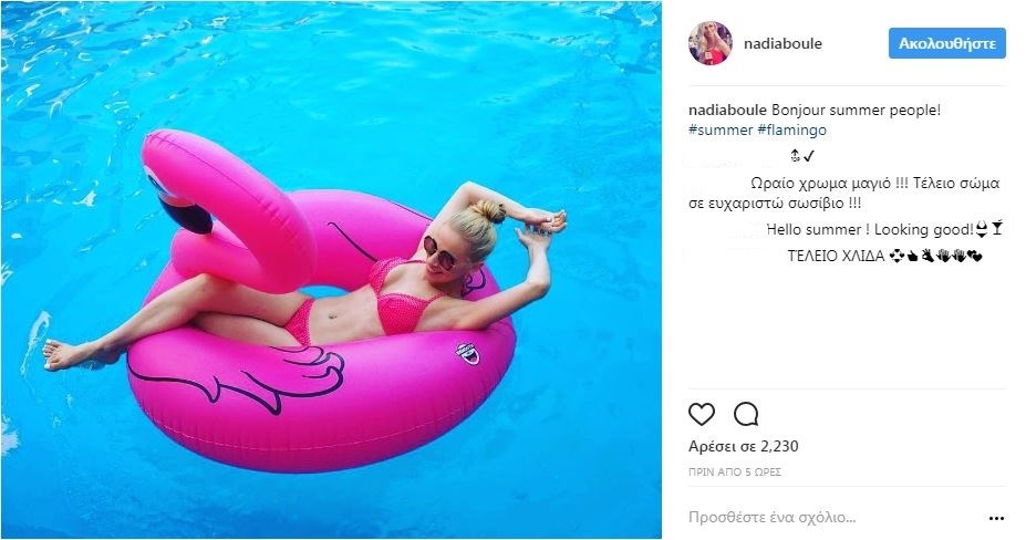 Πανικός έχει προκληθεί στις ελληνικές παραλίες με τα πασίγνωστα «ροζ φλαμίνγκο». Τα φλαμίνγκο τα βλέπουμε παντού, ενώ χιλιάδες γυναίκες ανεβάζουν φωτογραφίες με αυτά στους προσωπικούς τους λογαριασμούς στα social media.Μία από αυτές είναι και η Νάντια Μπουλέ, η οποία ανέβασε σήμερα μία φωτογραφία στο Instagram, στην οποία ποζάρει μέσα στην πισίναμε το ροζ φλαμίνγκο της.Η ηθοποιός έχει άκρως καλοκαιρινή διάθεση, ενώ η φωτογραφία απέσπασε χιλιάδες likes από τους διαδικτυακούς της φίλους.Δείτε την ανάρτηση: