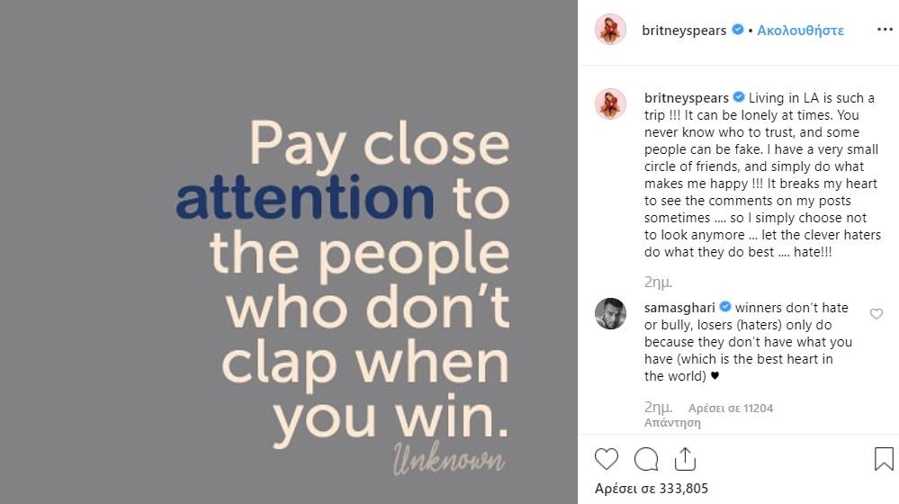 Η διάσημη τραγουδίστρια Μπρίτνεϊ Σπίαρς αναφέρθηκε στη μοναξιά που νιώθει καθώς και σε όσα την πληγώνουν σε μία ανάρτηση που έκανε στον προσωπικό της λογαριασμό στο Instagram.