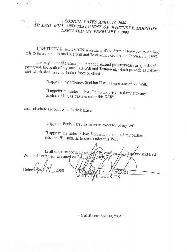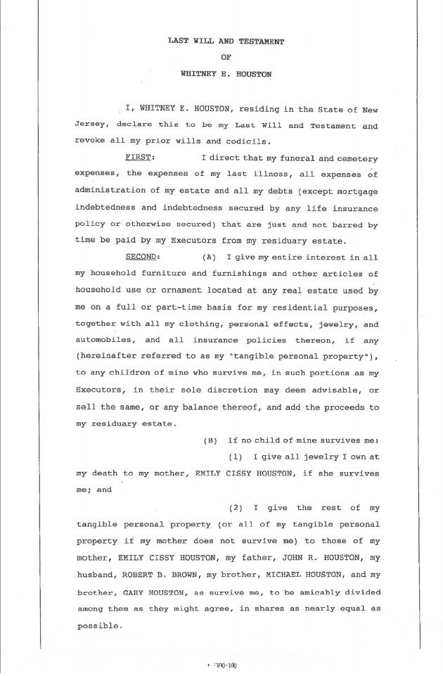 Η Whitney Houston τα αφήνει όλα στην κόρη της Bobbi Kristina, σύμφωνα με τη διαθήκη της. Η τραγουδίστρια είχε υπογράψει το έγγραφο το Φεβρουάριο του 1993, ένα μήνα πριν τη γέννηση της Bobbi Kristina.Η διαθήκη τροποποιήθηκε το 2000 και αναφέρει πως όλα τα προσωπικά αντικείμενα και οτιδήποτε ανήκει στη Whitney Houston θα ανήκουν στα παιδιά της.