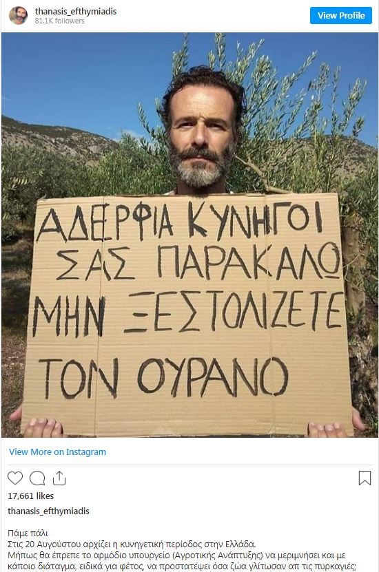 ”Πάμε πάλι. Στις 20 Αυγούστου αρχίζει η κυνηγετική περίοδος στην Ελλάδα. Μήπως θα έπρεπε το αρμόδιο υπουργείο (Αγροτικής Ανάπτυξης) να μεριμνήσει και με κάποιο διάταγμα, ειδικά για φέτος, να προστατέψει όσα ζώα γλίτωσαν απ’ τις πυρκαγιές; Μήπως θα έπρεπε οι αρμόδιοι να σκεφτούν ότι τα ζώα που γλίτωσαν θα βρεθούν σε άγνωστα δάση, όπου δεν θα έχουν τις φωλιές τους, τις οικογένειες τους, τα γνωστά τους μέρη που έβρισκαν νερό και τροφή; Μήπως θα έπρεπε να σεβαστούμε το σοκ που βίωσαν και την κατάσταση πανικού στην οποία βρίσκονται;