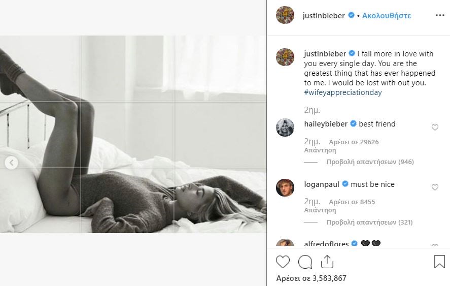Ο Τζάστιν Μπίμπερ είναι πολύ ευτυχισμένος στο πλευρό της συζύγου του, Χάιλι Μπόλντουιν, και δεν σταματά να διατυμπανίζει τον έρωτα του για αυτή.