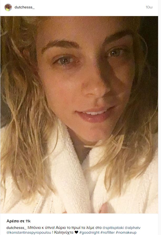 Με μία φωτογραφία αμέσως μετά το μπάνιο, χωρίς ίχνος make up, η Δούκισσα Νομικού καληνύχτισε τους followers της στο Instagram.