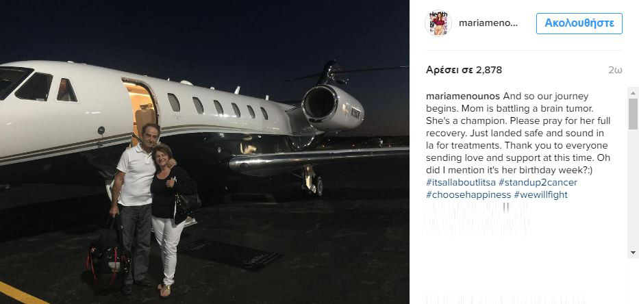 Όπως έγραψε στο προφίλ της στο instagram η μητέρα της έχει όγκο στον εγκέφαλο και η Μαρία Μενούνος ζήτησε από όλους τους διαδικτυακούς φίλους της να προσευχηθούν για την υγεία της.