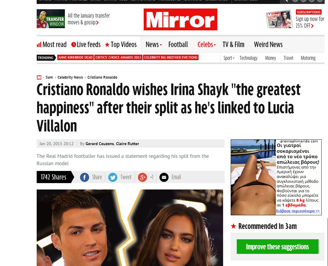 «Μετά από πέντε χρόνια δεσμού, η σχέση μου με την Ιρίνα Σάικ τελείωσε. Πιστεύαμε ότι θα ήταν καλύτερο και για τους δυο μας να πάρουμε αυτή την απόφαση. Της εύχομαι την μεγαλύτερη ευτυχία» δήλωσε ο Ρονάλντο.