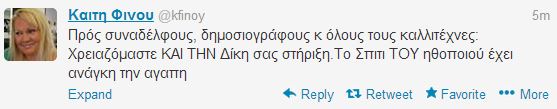 Μέσω του προσωπικού της λογαριασμού στο twitter, η γνωστή ηθοποιός Καίτη Φίνου καλεί ηθοποιούς, δημοσιογράφους και όλους τους καλλιτέχνες να βοηθήσουν το Σπίτι του Ηθοποιού που έχει ανάγκη.