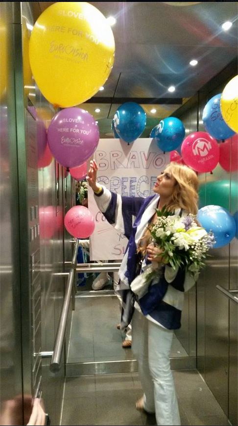 Όταν μπήκε στο ασανσέρ οι φίλοι της οι Σλοβένοι της έγραψαν σ’ ένα χαρτόνι στα αγγλικά «Μπράβο Ελλάδα! Συγχαρητήρια! Οι φίλοι σου από τη Σλοβενία».