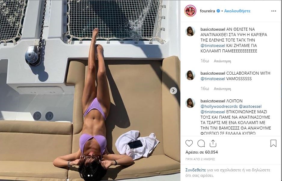 Η Ελένη Φουρέιρα συνδυάζει το τερπνόν μετά του ωφελίμου. Μπορεί το καλοκαίρι να πραγματοποιεί εμφανίσεις σε διάφορες περιοχές, όμως, “ξεκλέβει” χρόνο και για την ίδια απολαμβάνοντας τον ήλιο και τη θάλασσα.