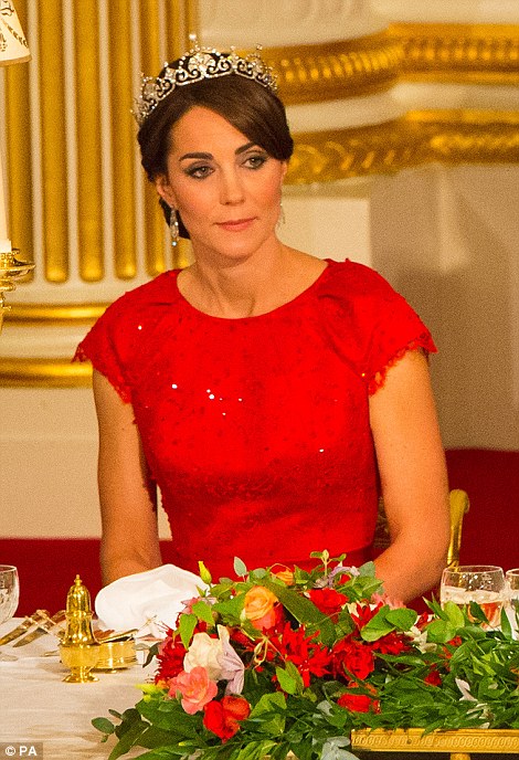 Η Δούκισσα του Κέμπριτζ απαστράπτουσα μέσα στο κόκκινο φόρεμα της και φορώντας μία τιάρα στα μαλλιά έκλεψε τις εντυπώσεις.