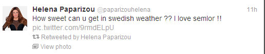 Η Έλενα Παπαρίζου πέταξε μέχρι την Σουηδία για να δει την οικογένεια και τους φίλους της, όπως κάνει κάθε φορά, που της το επιτρέπουν οι επαγγελματικές της υποχρεώσεις. Αργά, χθες το βράδυ, μέσω twitter αποκάλυψε την μεγάλη της σουηδική αδυναμία: