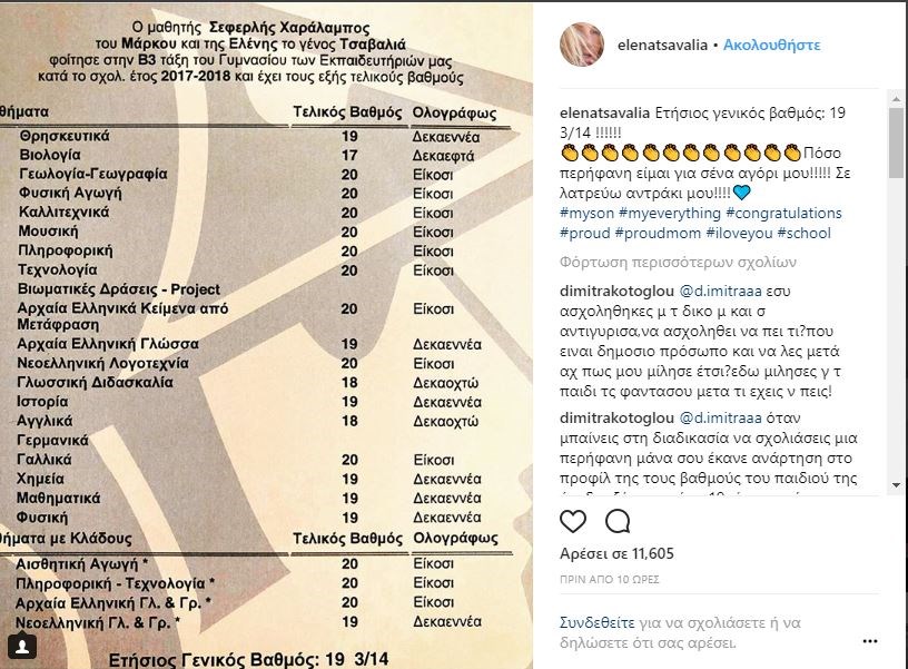 «Ετήσιος γενικός βαθμός: 19 3/14 !!!!!!Πόσο περήφανη είμαι για σένα αγόρι μου!!!!! Σε λατρεύω αντράκι μου!!!! #myson #myeverything #congratulations #proud #proudmom #iloveyou #school», σχολίασε γεμάτη χαρά κάτω από την αναλυτική του βαθμολογία.
