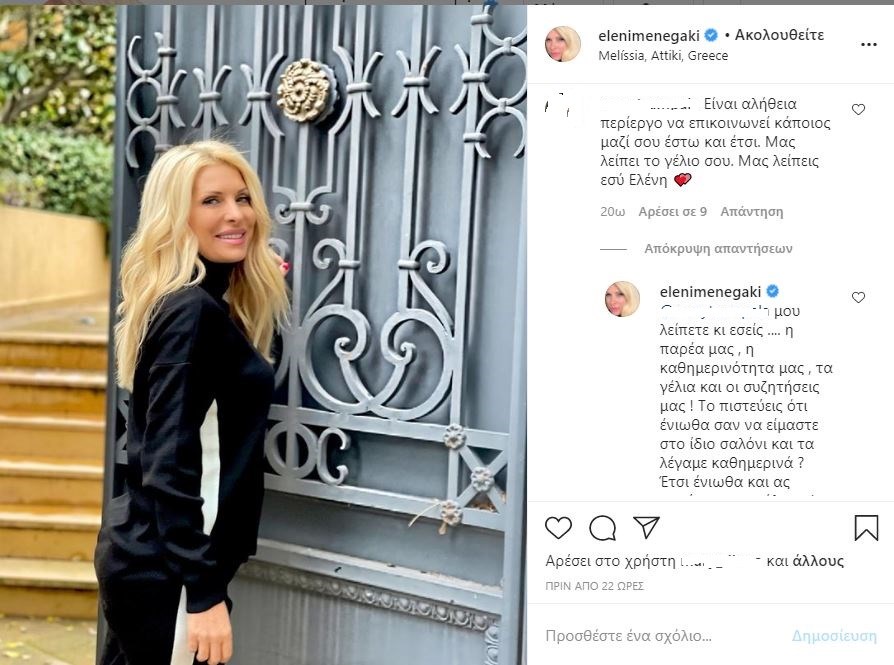 Ζωντανή και έντονη διατηρεί τη σχέση της με τις τηλεθεάτριές της η Ελένη Μενεγάκη μέσω instagram, όπου απαντά στα λόγια αγάπης. Μπορεί να έχει αποχωρήσει εδώ και μήνες από την τηλεόραση αλλά ο δεσμός με τις ακολούθους της παραμένει δυνατός. Αρχικά μία διαδικτυακή φίλη της σχολίασε σε ανάρτησή της παρουσιάστριας πόσο της λείπει η ίδια από την τηλεόραση: “Η έλλειψή σου αισθητή, το γέλιο, το νάζι,η αισιοδοξία σου…” όπου η Ελένη Μενεγάκη απάντησε: “Τι όμορφα λόγια μου λέτε όλοι σας …. μου χαϊδεύετε την καρδιά” και ακολούθησε επόμενη ακόλουθος: