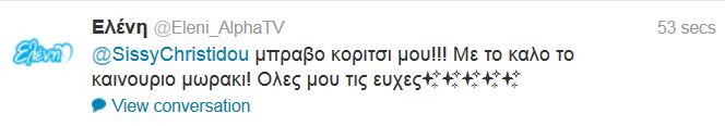 Μέσω twitter επέλεξε η Ελένη Μενεγάκη να συγχαρεί την Σίσσυ Χρηστίδου για την δεύτερη εγκυμοσύνη της.