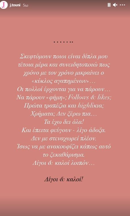 Σκεφτόμουν ποιοι είναι δίπλα μου τέτοια μέρα και συνειδητοποιώ πως χρόνο με τον χρόνο μικραίνει ο “κύκλος των αγαπημένων”… Οι πολλοί έρχονται για να πάρουν… Να πάρουν φήμη; Follows και likes; Πρώτα τραπέζια και highλίκια; Χρήματα; Δεν ξέρω πια… Τα έχω δει όλα! Και έπειτα φεύγουν -λίγο άδοξα. Δεν με στενοχωρεί πλέον. Ίσως να με ανακουφίζει κάπως αυτό το ξεκαθάρισμα. Λίγοι και καλοί λοιπόν…