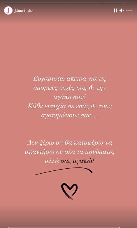 Ευχαριστώ άπειρα για τις όμορφες ευχές και την αγάπη σας. Κάθε ευτυχία σε εσάς και τους αγαπημένους σας. Δεν ξέρω αν θα καταφέρω να απαντήσω σε όλα τα μηνύματα, αλλά σας αγαπώ».