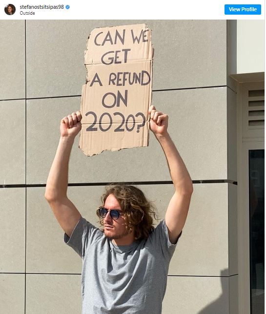 Οι δυο τους φωτογραφήθηκαν κρατώντας δύο πλακάτ, με τον “Dude with sign” να ζητάει από τον Στέφανο να κερδίσει ένα Grand Slam, ενώ ο Έλληνας τενίστας τον παρότρυνε να… κουρευτεί.