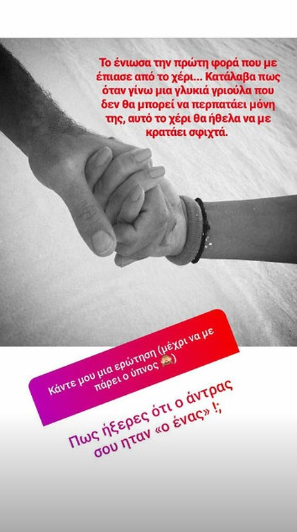 “Το ένιωσα την πρώτη φορά που με έπιασε από το χέρι… Κατάλαβα πως όταν γίνω μία γλυκιά γριούλα που δεν θα μπορεί να περπατάει μόνη της, αυτό το χέρι θα ήθελα να με κρατάει σφιχτά.”