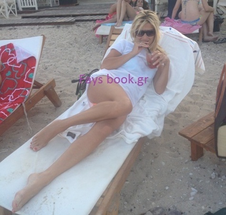 Φορώντας ένα λευκό, μακό μπλουζάκι η γνωστή παρουσιάστρια πίνει στην υγειά μας, όπως σχολιάζει στη φωτογραφία που ανέβασε νωρίτερα στο Twitter, ξαπλωμένη σε μια ξαπλώστρα σε κάποια ελληνική παραλία.