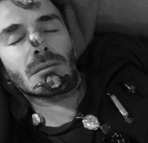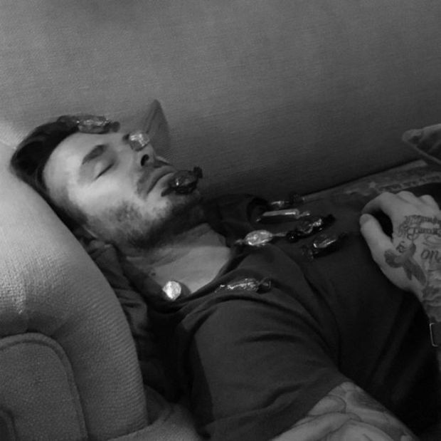 Όπως φαίνεται και στις φωτογραφίες όταν ο Μπέκαμ έκλεισε τα μάτια του για να ξεκουραστεί, ο γιος του καραδοκούσε και του γέμισε το πρόσωπο με καραμέλες και σοκολατάκια.