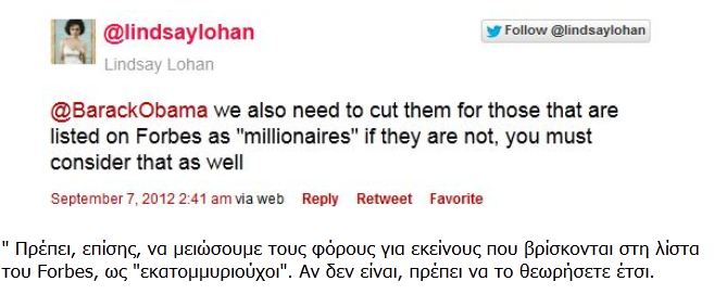 Γι΄αυτό η Lindsay είχε στείλει tweet στον Obama και του έλεγε να μειώσει τη φορολογία των εκατομμυριούχων.