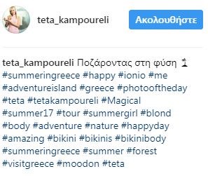 Η Τέτα Καμπουρέλη, παρόλο που είναι ήδη γιαγιά, διαθέτει ένα εντυπωσιακό κορμί, το οποίο θα ζήλευε ακόμη και μία 20χρονη.Η γνωστή αισθητικός ανέβασε σήμερα στον προσωπικό της λογαριασμό στο Instagram, τρεις φωτογραφίες, όπου ποζάρει με άκρως καλοκαιρινή διάθεση, φορώντας τρία διαφορετικά σέξι μπικίνι, σε κίτρινο, πράσινο και μαύρο χρώμα. “Ποζάροντας στη φύση”, ήταν η λεζάντα που συνόδευε την ανάρτησή της, ενώ τα likes από τους διαδικτυακούς της φίλους “έπεσαν βροχή”.